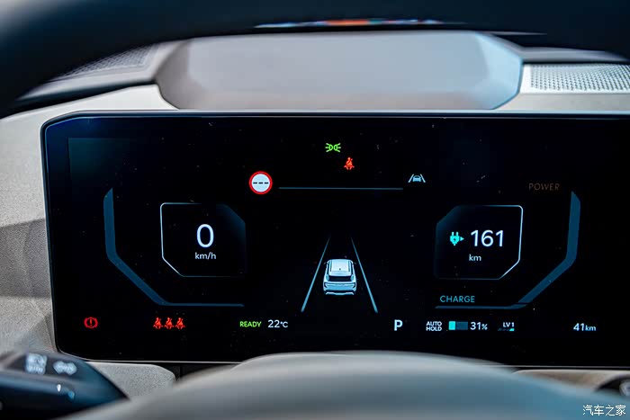 驾驶员前方是一块12.3英寸的全液晶仪表盘,左侧显示时速,右侧显示剩余续航里程,中间可切换显示车辆信息。