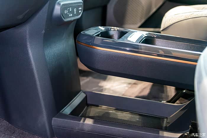 后排中央抽屉式储物箱,容量为4.0L,可以放置一些小物件。如果是22.58万的车型,则为车载冰箱。温度范围为5至55摄氏度,可以温热美食、冰镇饮料,我想小朋友们一定很喜欢。