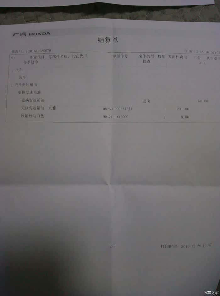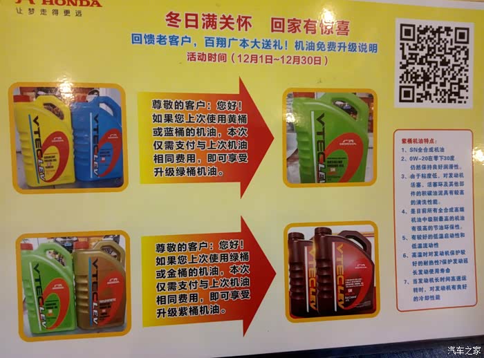 14年8月提的车,快两年半时间了,从开始的兴奋到现在的平常心,飞度给我的生活带来了超大的便利。事实证明当初选择飞度没错,就是省心,到现在飞度已经行驶35000公里了,除了节气门问题外,(个人认为也不算什么问题,不管什么车节气门都会脏,看个人的用车习惯了,我是20000才自己洗的第一次)其他一切正常,后来也没升过ECU。 本月4S店发消息说12月底之前有机油升级活动,上一次保养用的绿桶这一次可以免费升级为紫桶。紫桶也是最近群里讨论比较多的,正好想体验一下498的机油是啥感觉,变速箱油也可以一起换了,好吧遂电话约好时间。下面上图