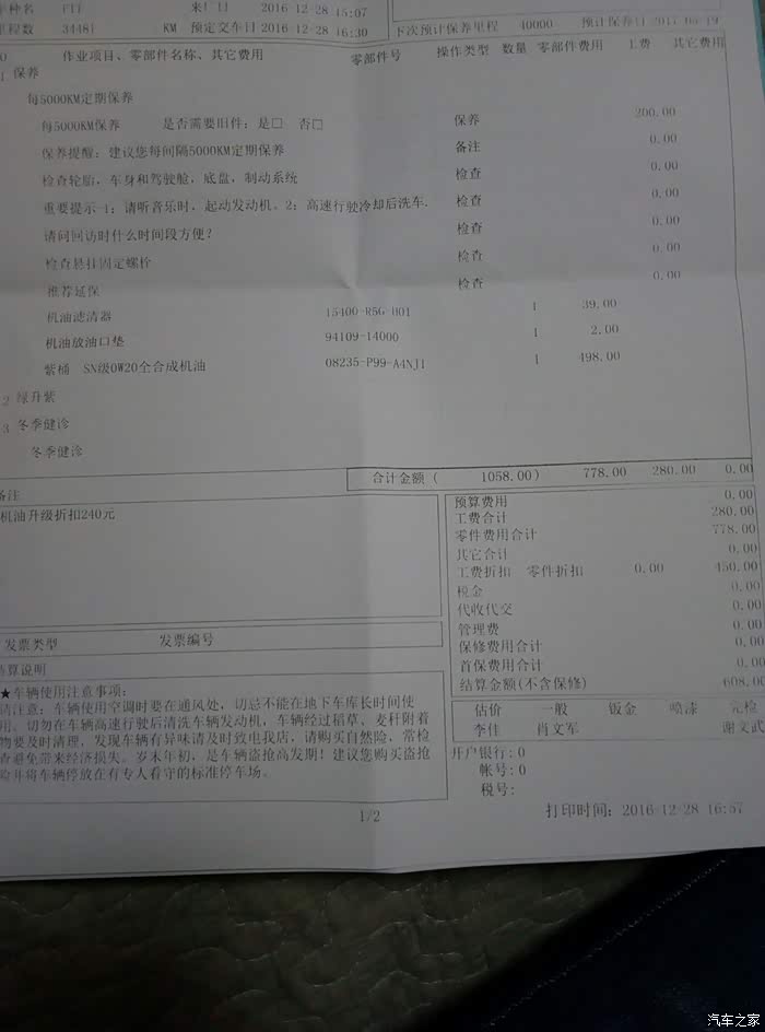 附结算单供大家参考,最终价格608-100-50红包,458,保养的师傅都说是白菜价了。