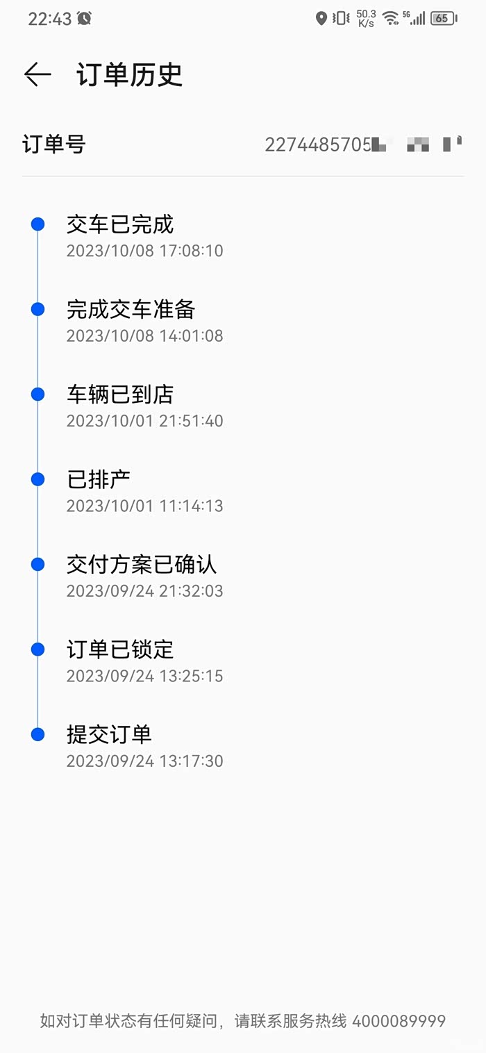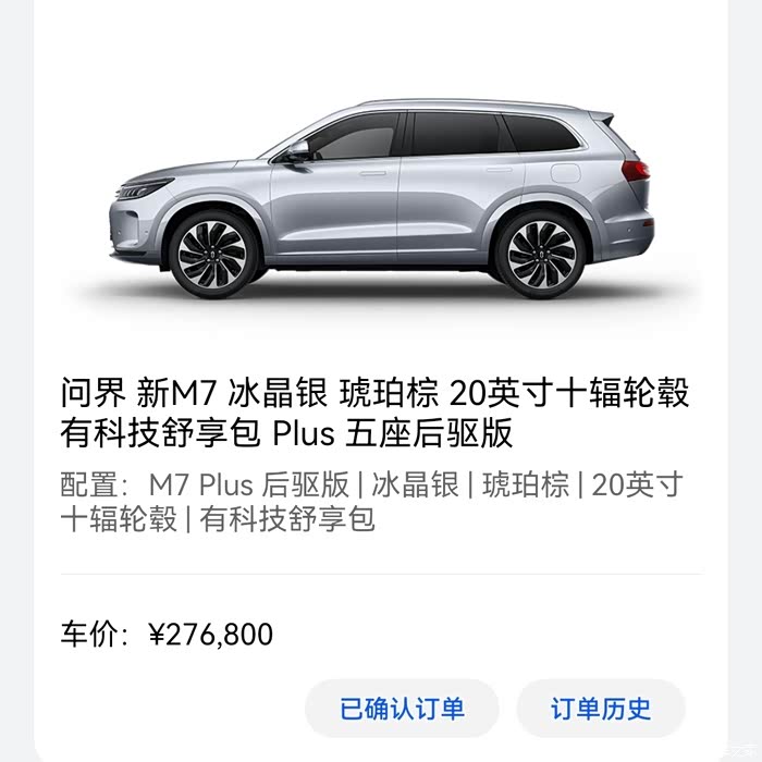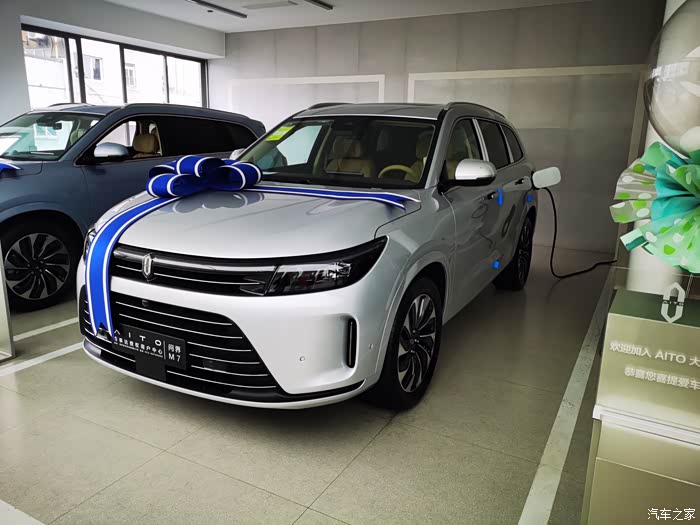 新M7上市营销期间,价格都是统一的。3.3万的综合优惠,包含了6千的现金优惠,1.2万的内外饰选装基金,1.5万的配置升级,再赠送一个原厂脚垫。外观颜色就冰晶银和天青兰需要另外加钱,本来不浪费的原则,自己选择冰晶新的外观。内饰有黑色,韶华杏,琥珀棕3种颜色,黑色不是真皮,杏色颜色太浅,选择了棕色。配置升级自己选择科技包,含有HUD抬显、头枕音箱、电吸门。9月24日大定,想着能不能马上提车,国庆开着出去玩,结果告诉我提车时间4-6周,只有回家安心等着了。期间每天刷着app上的订单进度,没想到10月1那天显示车就到店了,赛力斯的速度确实遥遥领先啊,想着是不是马上可以提车了。马上客服群里面问了一下,结果告诉由于国庆期间,一些手续没有到店,临牌也没发开,还是得等倒国庆以后了。10月6号,交付专员跟我约时间了,7号上班第一天需要到公司处理一些事情,约好8号下午到店提车。