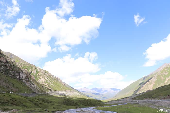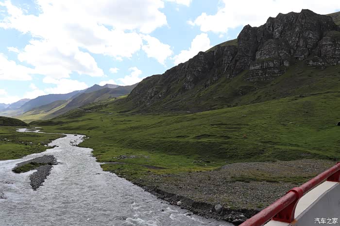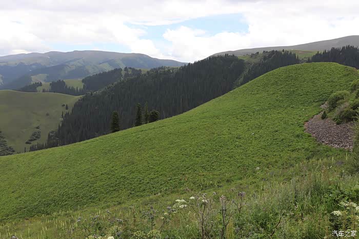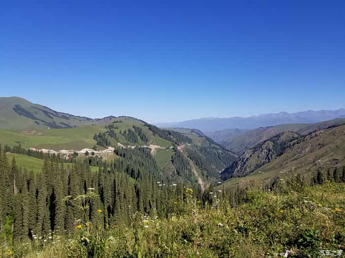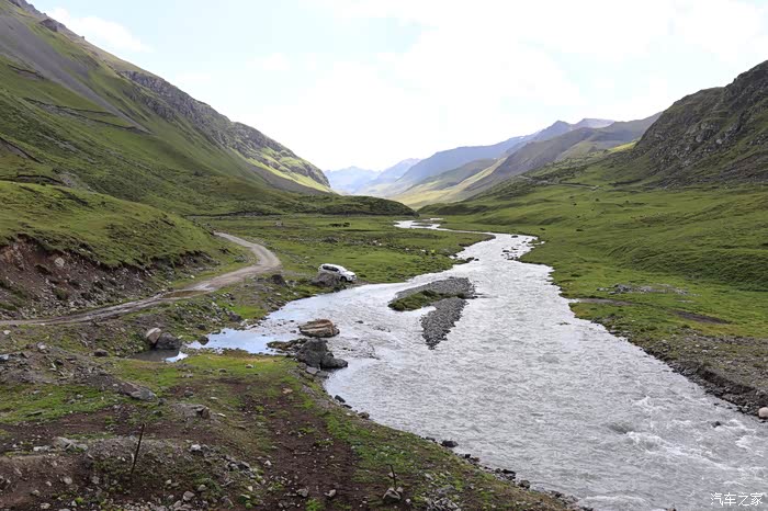 盛开的野花在路两旁迎风招展,一条数米宽的河流从山上奔淌而下,山坡上是绿色的草场,间或有茂密的树林挺立其中。