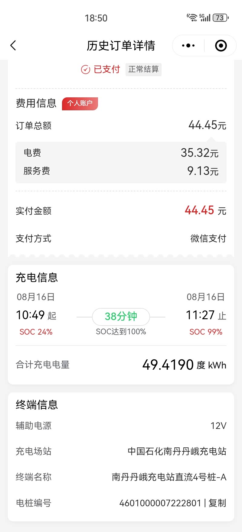 这次的充电站属于中国石化,在小程序石化易电处扫码即可,充电功率也是比较稳定,从23%开始充电至79%,功率基本都是在104.1kw,我是从10点49分开始充电,到达79%时,耗时23分钟;到81%功率会开始下降并稳定在69.5kw;再往后到达90%功率还会继续下降,本次充满电量一起耗时38分钟,对于我来说,这个时长还是能接受的,毕竟从家里满电出发一口气跑了265.5公里,适当休息吃点东西,也合适了。