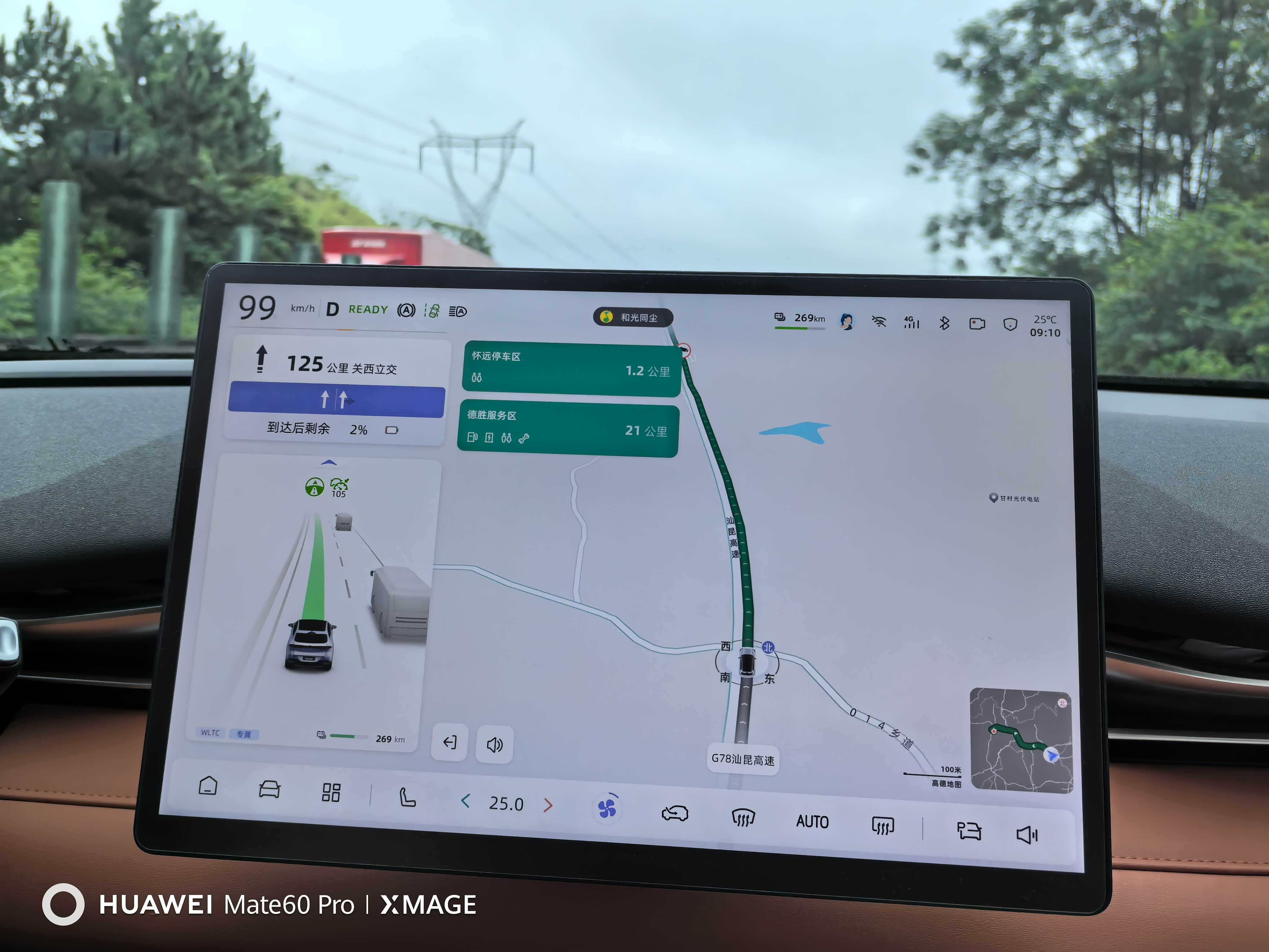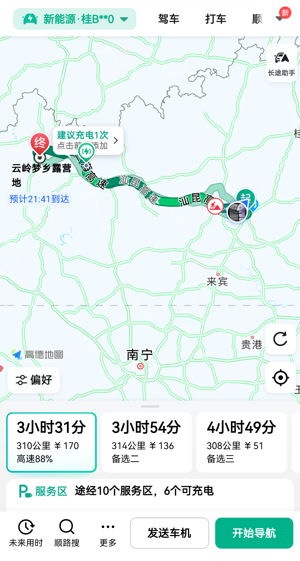 这次旅程,我们是从柳州出发,全程有310公里,在手机高德地图规划好行程之后,点击发送车机,这样车机高德地图就会接收并开始导航,因为我走的是推荐路线,所以基本以高速优先,按照车机高德地图给的剩余电量提示,本次路程可以无需中途充电,直接到达目的地,但是考虑到目的地附近没有合适充电桩,所以我们的行程会在南丹县城做一个充电停留。