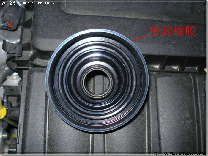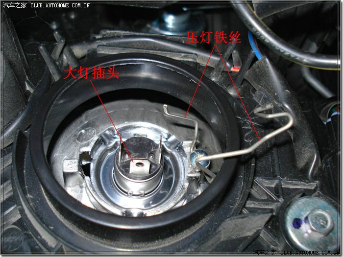 这就是拔出密封橡胶后的样子,里面还有一根压灯的铁丝固定着车灯,照下面的方法移出压灯铁丝后就可以捏着大灯插座取出大灯了,注意不要碰到灯体,注意点就不会!