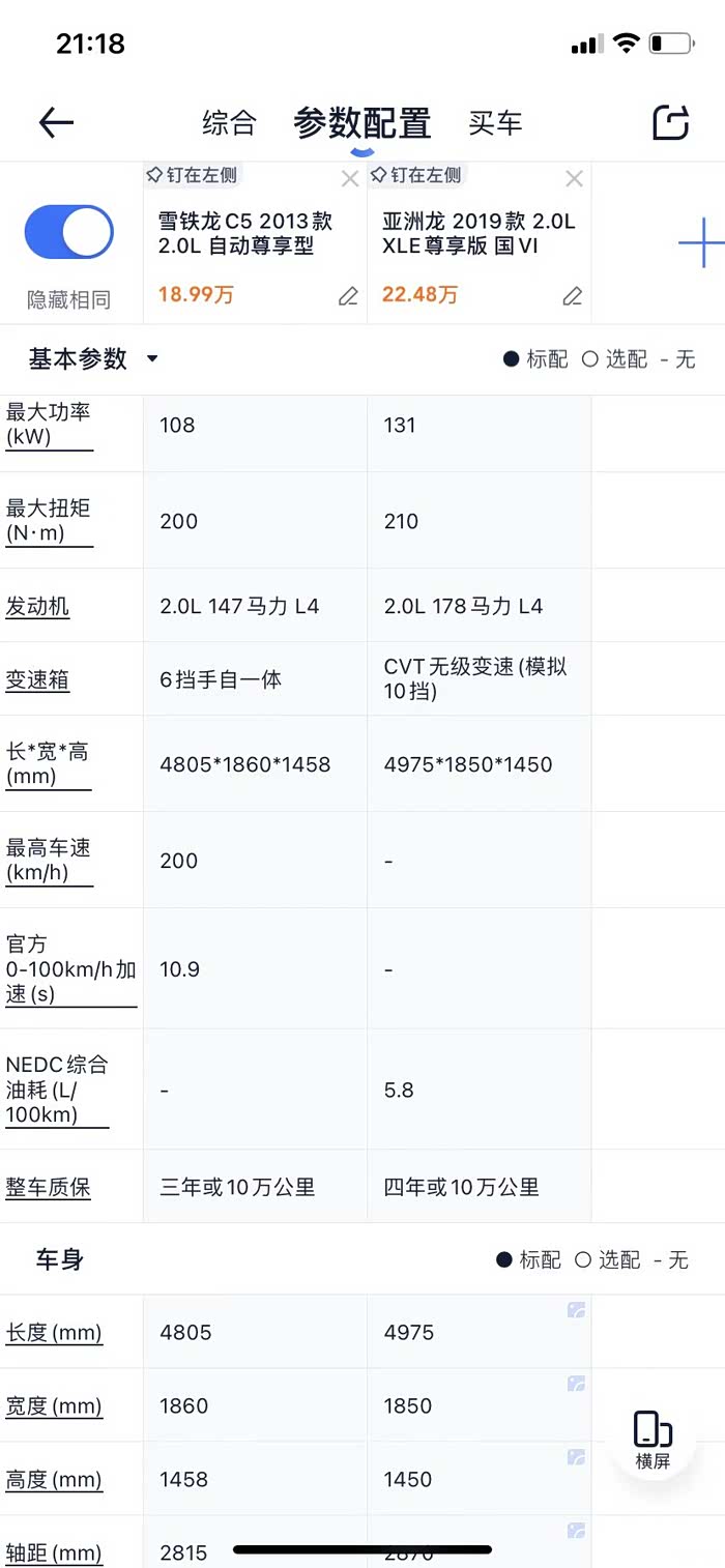 如果直接看发动机的扭矩,不考虑变速箱的效率发动机的功率以及轮上功率之类的细节,简单的算一下,在整备质量大致相同的情况下(C5 2.0为1580KG,亚洲龙2.0为1595KG),亚洲龙2.0的加速能力大概比C5 2.0快了5%(C5 功率是108KW 147马力,扭矩200N.M,官方01加速10.9秒),这样一说是不是就很容易理解了