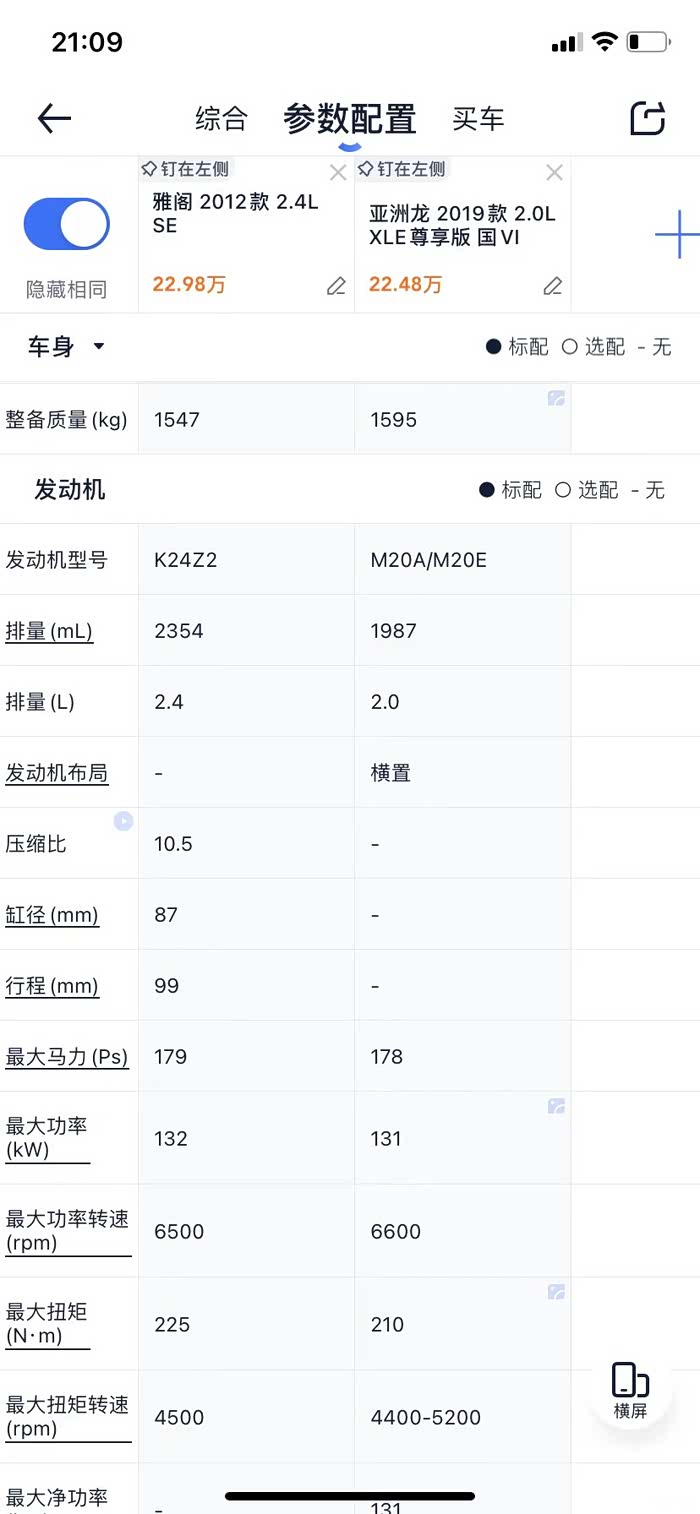 如果直接看发动机的扭矩,不考虑变速箱的效率发动机的功率以及轮上功率之类的细节,简单的算一下,这几台车在整备质量大致相同的情况下(8代雅阁1547KG,亚洲龙2.0为1595KG),亚洲龙2.0的加速能力大概比老款8代雅阁2.4慢了6%,这样一说是不是就很容易理解了