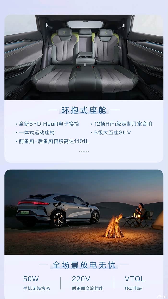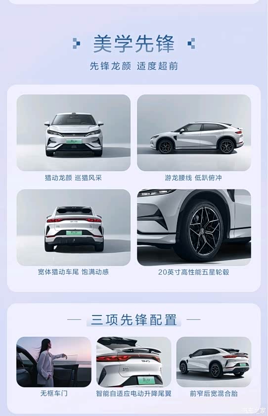 采用“龙颜美学”设计,无框车门、电动尾翼、19英寸轮毂等运动元素,新增曜石黑、星河米等车色。内饰以宋代庭院为灵感,提供暮云灰等配色,细节处融入科技感与豪华感。