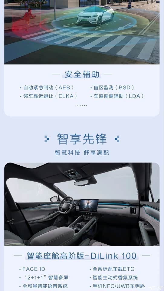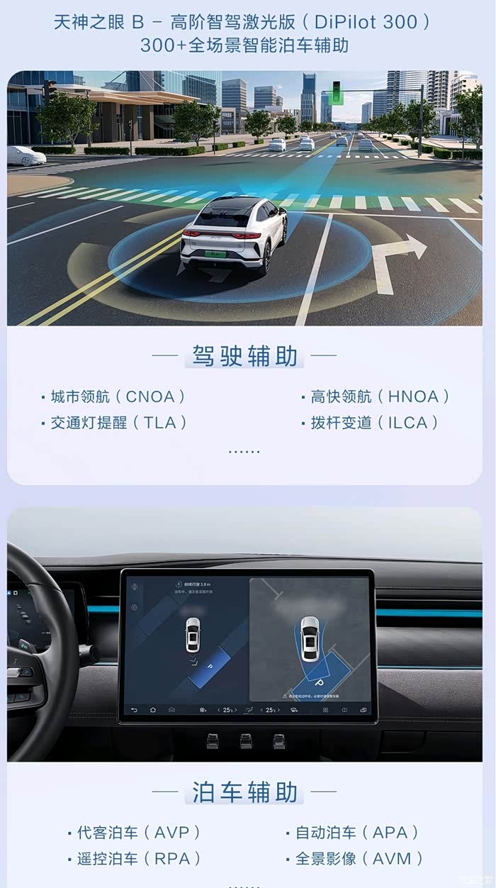 全系标配“天神之眼”高阶激光智驾系统B(DiPilot 300),配备高达30枚传感器(含毫米波雷达、摄像头、超声波雷达),支持高速领航(NOA)、智能泊车(300+场景)、遥控泊车及代客泊车功能。