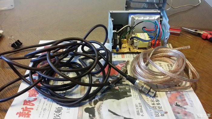 准备材料----一根四米长度的原有喇叭线,作为电源线。一根歌厅麦克风的讯号线,带屏蔽的,作为讯号线。结合麦克风的插口,配一个插口组成公母连接件。买一只坏的电脑电源,拆下零配件充当需要的零配件--电源接口,电解电容,电感器,等等。