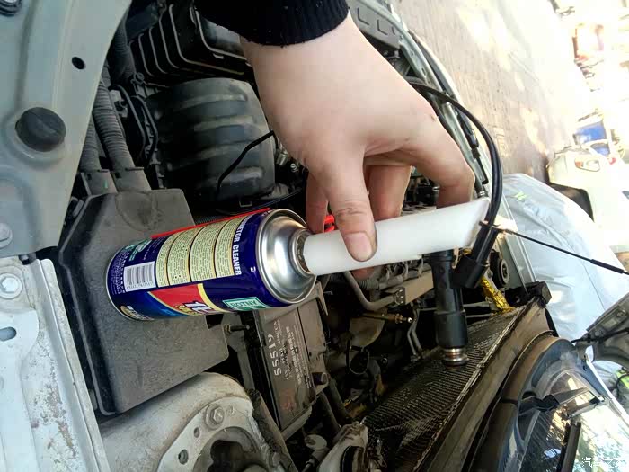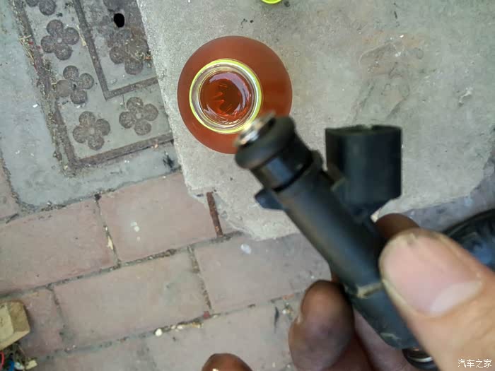 正极连接好,用另一只手以0.5秒的频率触碰电瓶负极,此时喷油嘴会断续工作,化清剂会从喷油嘴中喷出,达到清洗效果。此时注意,电瓶负极不可长时间接触,会损坏喷油嘴。我的喷油嘴状况算是不错的,开始稍微有点柱状喷射,几下之后就成了全雾状了。四个喷油嘴,挨个清洗完毕。