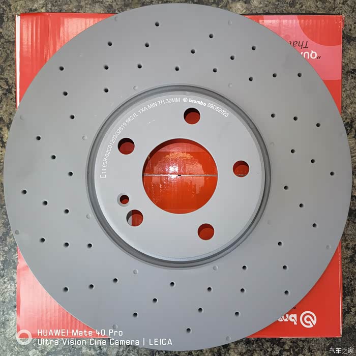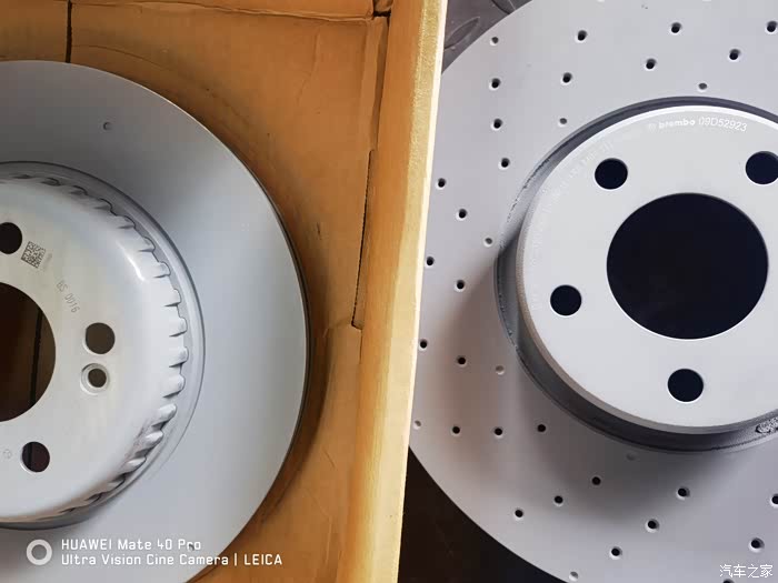 原车是平面盘,查到E级和C级轿跑的打孔盘也可以给E300L用,对比了某雷博打孔盘和原厂平面盘的参数后,决定一次性升级到打孔盘,于是在某雷博官方旗舰店买了一对打孔前盘,其他前刹车片和后盘后片用原厂件。