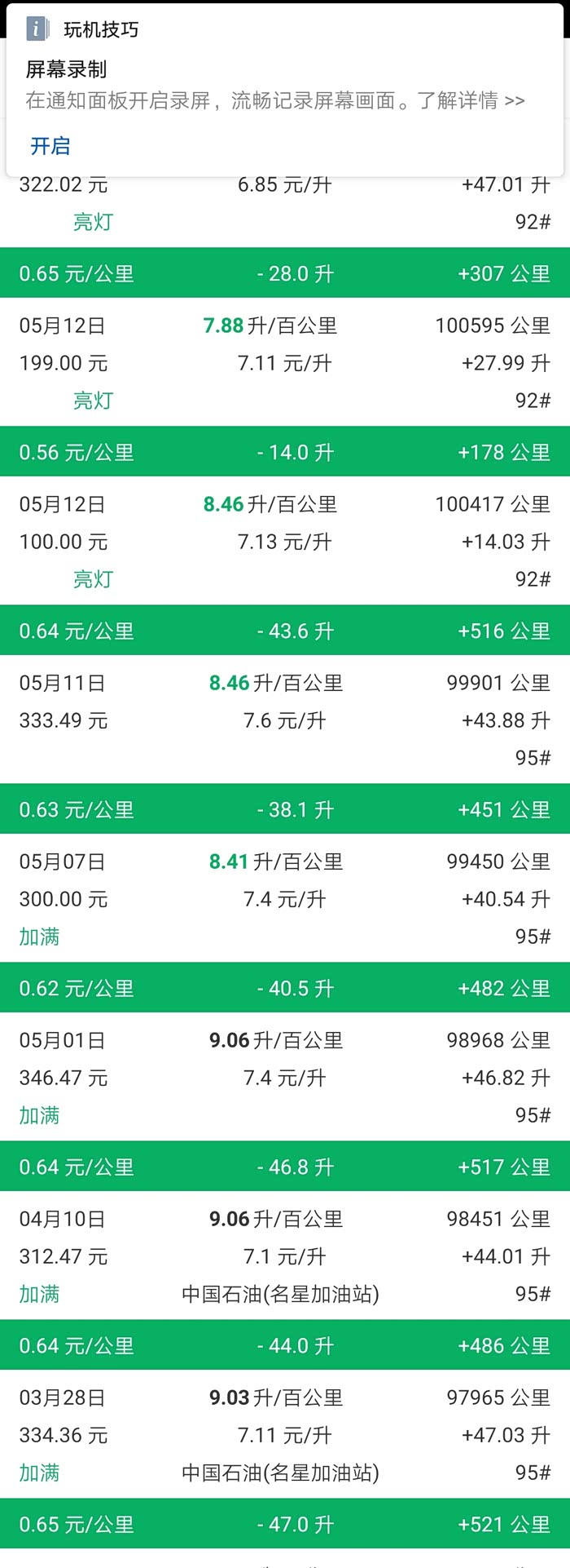 一般我都是开到一格油,油灯亮了,或者“燃油不足”字样出现后再加油记录。当然这不是好习惯