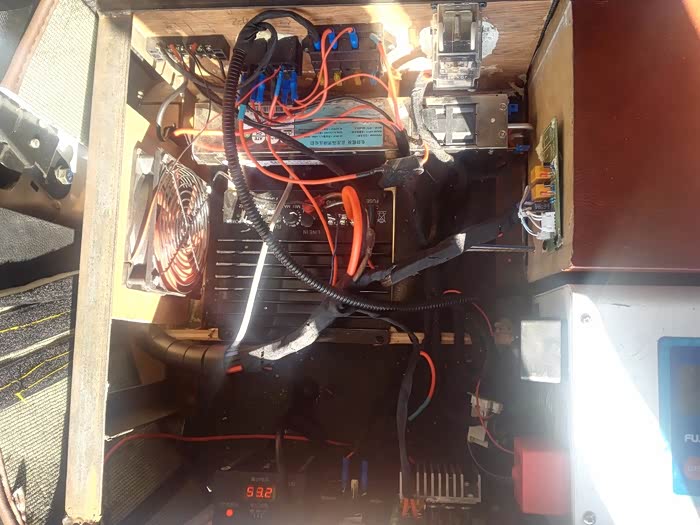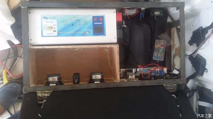 后排座椅底座改成角铁架,里面放2000W工频逆变,都我改的差不多的时候才发现我几乎在用不到他了,我所有的电器都是直流低压电,想想能干什么?对了 我看也就只能放个电磁炉做火锅吃了, 不对,,这玩意还可以接市电,也可以给电池充电的,旁边自制双4.5寸低音炮,试听完后当场榔头敲掉 为了赶工没想那么多,1板子太薄,2漏风 3导向管过小过短,听出来都是风声和共振声,也没有做过这么小尺寸喇叭的低音炮,最后跑到美居板材区找那个师傅要了些他们不用的18毫米厚的密度板还帮我下好料,买了些木工胶,4寸PVC管导向管,回家粘接好放了2天后在接家里功放调试,导向管长短调试,这低音炮费了我不少时间来折腾,不负众望效果出来了,和家里8寸低音炮效果差不多,真是土嗨,屁颠屁颠的安装好在车上,座椅放好坐在低音炮上等着土嗨,NM怎么没有家里效果好,调试半天不觉的怎么样,只见车玻璃震不见像在家里那浓浓的土嗨声,也就是说低音没有在家里那么强劲,难到功放功率不够?这时在车边转悠的时候才发现这地低音炮是有空间的,特别是在车尾和坐主驾前才有那种好的效果,离的太近反而没效果,,这低音炮学问真多,我以前认为家庭影院低音炮可能是最简单的,我现在才觉的他是最难的,,右边是电路系统 有48V转12隔离电源 48V转24V隔离电源 低压保险坐,4个继电器 功放板,音频切换器 MPPT太阳控制器等 电路是这次改装的心脏,能用隔离电源的尽量用隔离的,要不那些影音系统喇叭共地噪音会让你求死不能,而且还能很好的保护电器被烧坏,保险不要嫌麻烦,一定要接,要全