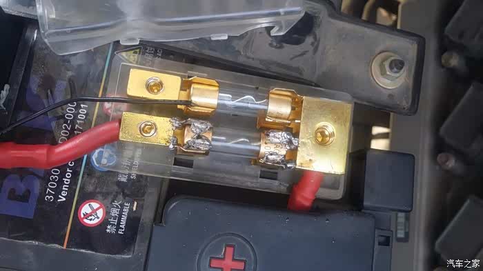 接功放板和升压器的1进2出保险,垃圾,NM还有脸卖100元,看上去金灿灿的就TM中间夹保险管的是铜,而且在大电流的情况下发热严重,看那盖子都烧变形了,还有更大的弊端,就是压降非常的大,当时我还以为升压器坏了,充电电流怎么变成10安不到的样子,拆下来还研究半天,最后我才确认这玩的的问题,看看我焊的样子还是管用,还是发热