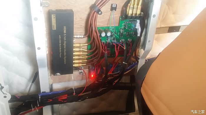 5.1D类数字功放板和次时代解码器也是在车壁上,这个功放板就是传说中的极度穷人功放板,,应为价格才190元, 带LCD屏和音量控制旋钮,这也算是个成品了, AV线是自己用话筒线做的,,效果超级好,我房间里那低音炮以前一开大就嗡嗡的响,不能开大,,买了无数条AV线不管用,最后不经意间用这话筒解决了这问题,
