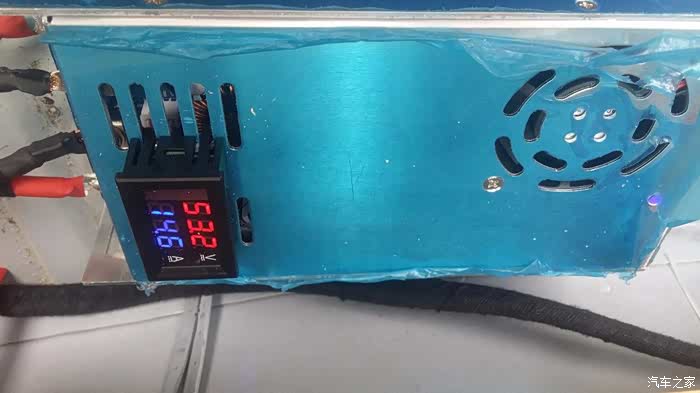 12V转56V升压器,也就是车载充电器,这玩意就是个半成器,但是效率还是不错的,,我怠速的情况下可以达的14安的电流,是56V的哦,这东西我纠结了好久不知道放在什么地方好,这玩意发热高,不能放在发动机里,也不能放在外面不防水,最后放在中门踏板边的上部位,这地方也觉了,很好,离主电瓶非常的近,这个可以用很短不需要太粗还可以减少压降的线,就可以很好的工作,