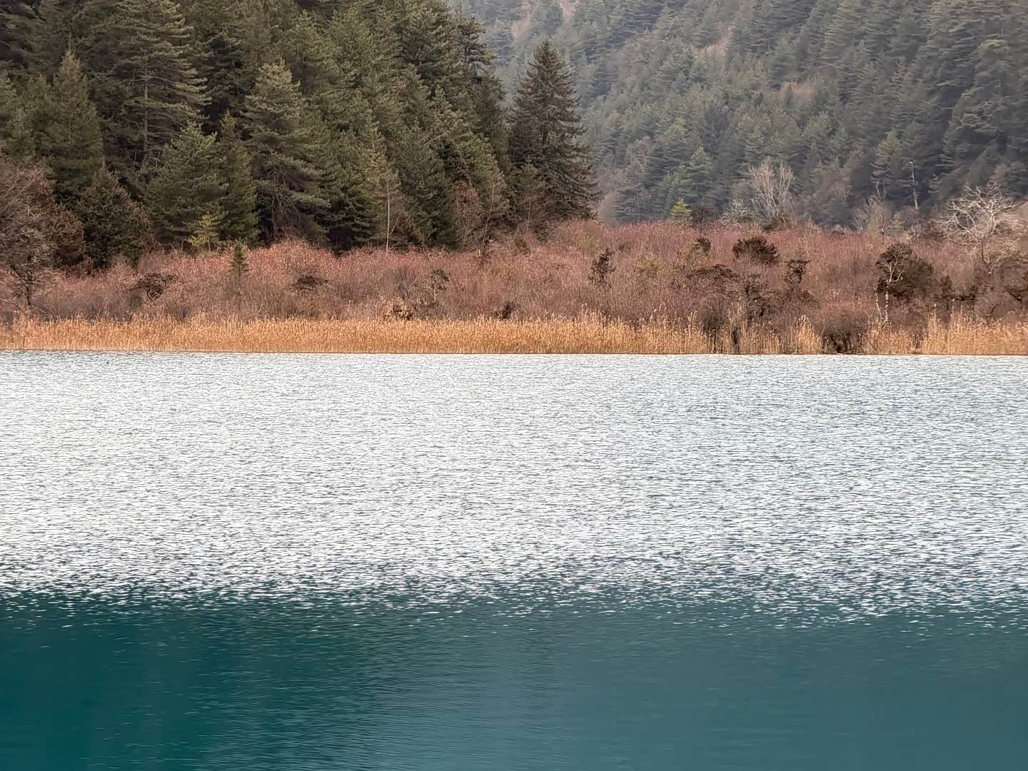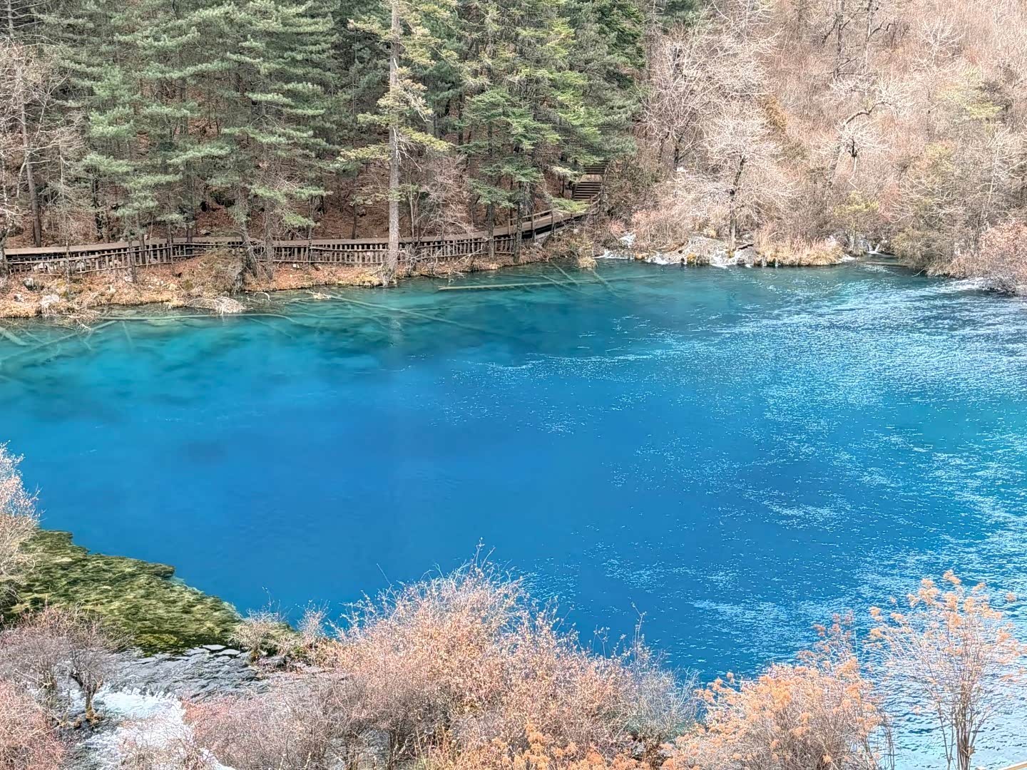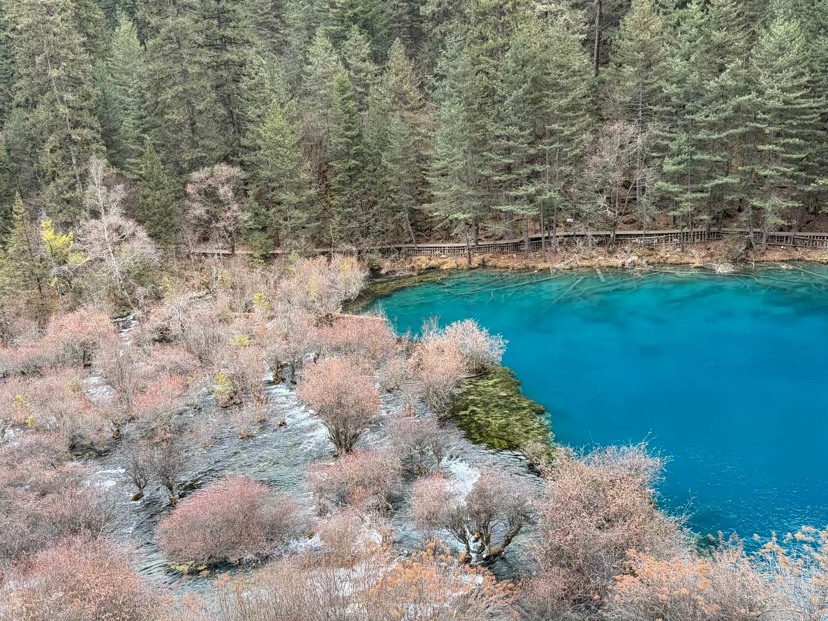 我们先去日则沟(右线)。淡季原始森林关闭,便从箭竹海开始逛。箭竹海的水绿得发蓝,岸边的树枝垂在水里,像画家用墨笔轻轻扫过。熊猫海景色稍逊,匆匆看过便往五花海走——这才是日则沟的灵魂。阳光透过树梢洒在水面,海子像被打翻的调色盘,蓝、绿、黄、橙交织着,水下的枯木清晰可见,据说这些树木已在水底沉睡了千年。站在栈桥上,忽然懂了“九寨归来不看水”的意思:这里的水,是有灵性的。