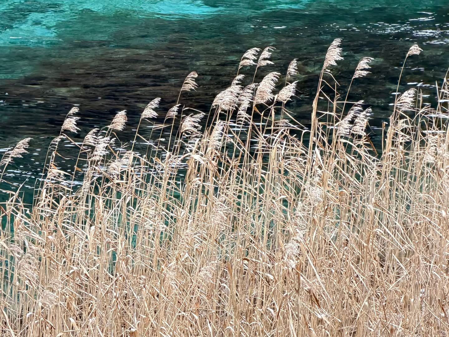 坐观光车进沟时,司机特意喊:“想拍芦苇海的坐左边!”果然,车过之处,一片金黄的芦苇荡在晨光里摇曳,水面倒映着山影,像幅流动的画。九寨沟分则查洼沟、日则沟、树正沟三条沟,观光车随上随下,合理规划路线是关键。