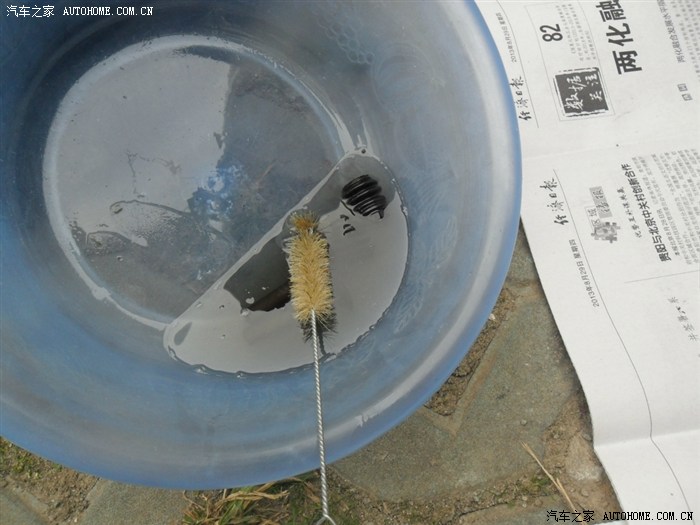 14、用刷子把导向销及防尘套里外都刷干净。看,原来干净的柴油开始变脏了。