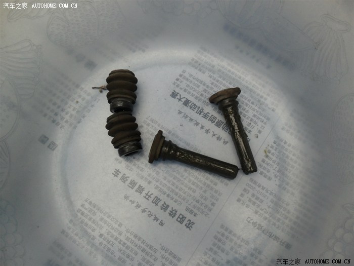 11、看看,这就是拔下的导向销及防尘套“全家福”。很脏吧,好几年没有动它们了。
