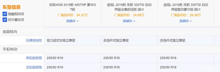 轮胎,4008的轮胎在品牌(马牌运动胎)、规格上占优。特别是途观舒适版,选用的韩泰18寸轮胎,不厚道。