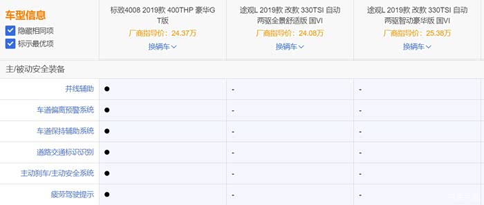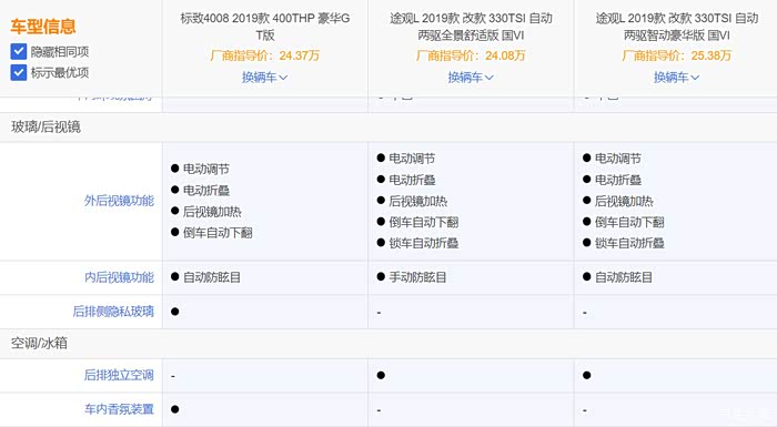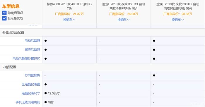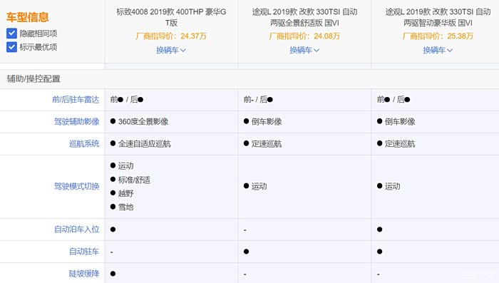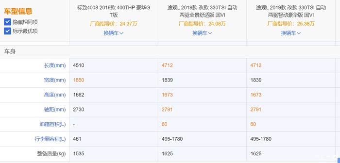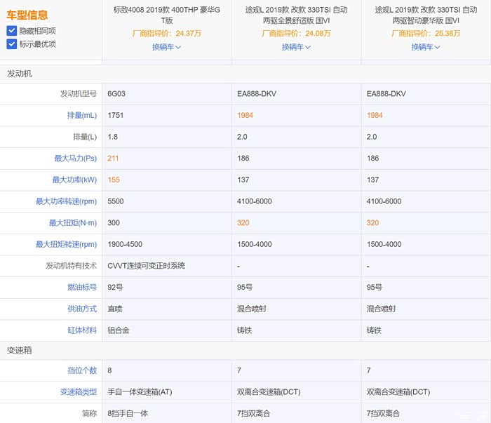 为了公平起见,选择4008GT和价位接近的2款途观(2驱舒适版和豪华版)进行数据对比。