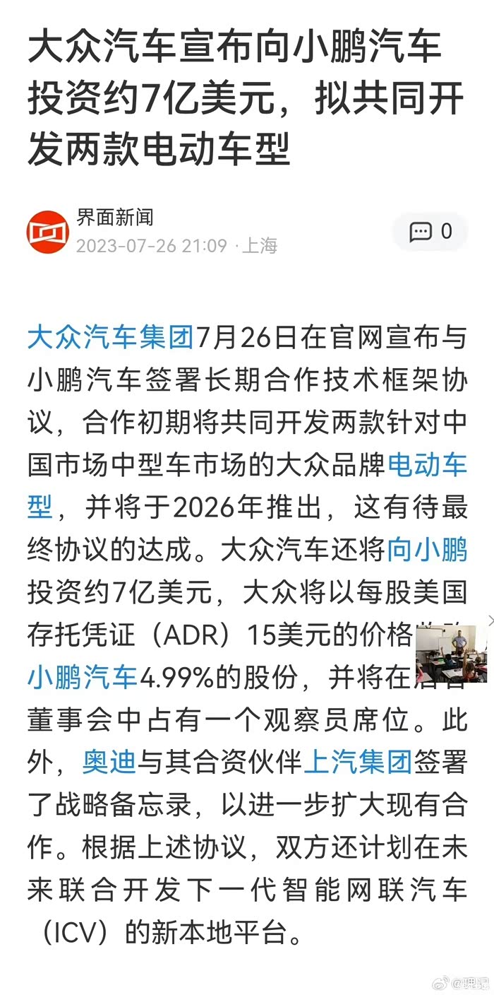 暴涨最高41%,大众汽车宣布向小鹏汽车投资约7亿美元,拟共同开发两款电动车型