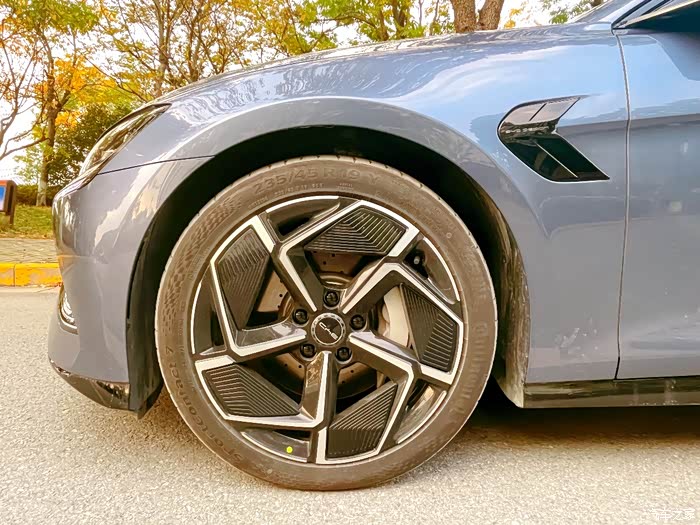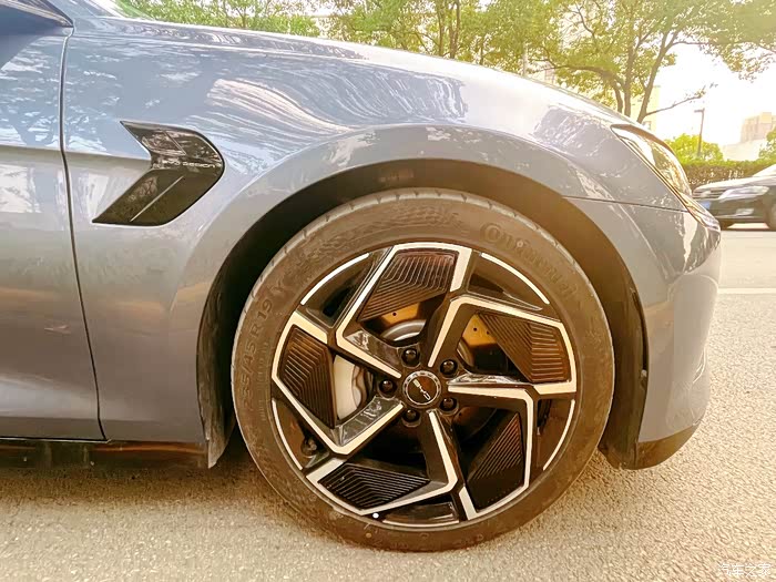 透过轮毂,有一个打孔的刹车盘,看着非常有新能范