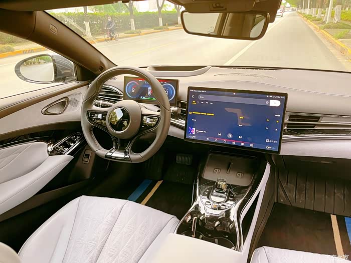 城市里面开折纯电的电动车比高速要香很多,首先就是车子在遇到堵车的时候跟随性很强,一走一停的时候呢,整个车身不会出现那种扭动的情况,很顺滑,而且这个外观,说实话,我觉得灰色要比北冰南更加好看一些,当然这是我自己的个人感受。再加上有一些车身的黑色套件的加持,整个外观设计就有了一点跑车的味道。特别是从外观到内饰,内饰里面两块很大的屏幕,而且边框都很窄,显示的信息足够的丰富,色彩也很艳丽,看起来就很有科技感。翻毛皮的加持让整个车厢都有了一股性能车的味道。但是我还是要吐槽新车状态依然是有异味的,而且皮革的味道还很重。