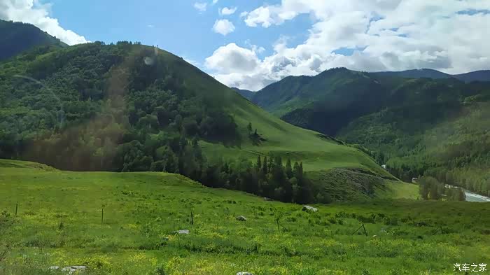 今天早上都是穿行在茫茫戈壁之中,没有什么特别的风景,中午过了乌伦古河后进入了草原地带,绿色多了起来,景色也好看了,但由于是6月初,草不是特别绿,偶见骆驼、马匹及羊群。到北屯市后树木多了,草木葱荣,再到阿勒泰就更不一样了,植被茂密,郁郁葱葱,白桦树绿白相间,又赶上下雨,远处山雨朦朦,很有景致,这里的建筑物全是俄罗斯风格的,当地人大部分都是哈萨克族人,真正的异域风情!很美的阿勒泰!下午到达布尔津,这个县号称童话边城,可见其魅力!特别是布尔津河穿城而过,河里长了很多白桦树,清清的河水和白桦树相映成辉!据说河里盛产各种鱼类,什么五道黑,大小红鱼、狗鱼之类的。过布尔津后向北,穿过一片沙漠、戈壁后进入冲乎尔乡,然后翻过一座山,就进入了风景优美的山地草原,之后天就黑了,我继续驱车于晚10点半到达贾登峪,休息一晚,等明天的重点戏!——向往已久的喀纳斯!这也是此行最重要的目的地之一!(之二是G219新藏线,之后会叙)