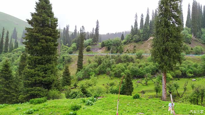 今天早上路过伊宁时,看到这里植被茂密,河流蜿蜒,农田阡陌纵横,俨然一派江南农耕景象,气候宜人,稍微有点热。很纳闷这里曾是古代流放之地!流放到这里不是来享福了吗?过了喀拉峻,开始下雨,还好雨不大,到了那拉堤时,依然下着雨。闻名的那拉堤草原此刻呈现在我眼前,远看确实很美!这里的草原和别处的不一样,都是丘陵式草原,地势比较平缓,没有太大的落差,草木丰茂,还有一簇簇的松树点缀其间,很有意境。更美妙的是随着丘陵蜿蜒起伏的轮廓线条,像美丽的人体曲线一样,尽显柔婉之娇美!和其他地方的一望无际的空旷草原、高山草甸性草原形成强烈对比!那拉堤————独特的草原美!(原谅我才思枯竭,江郎才尽,找不到词来形容了)