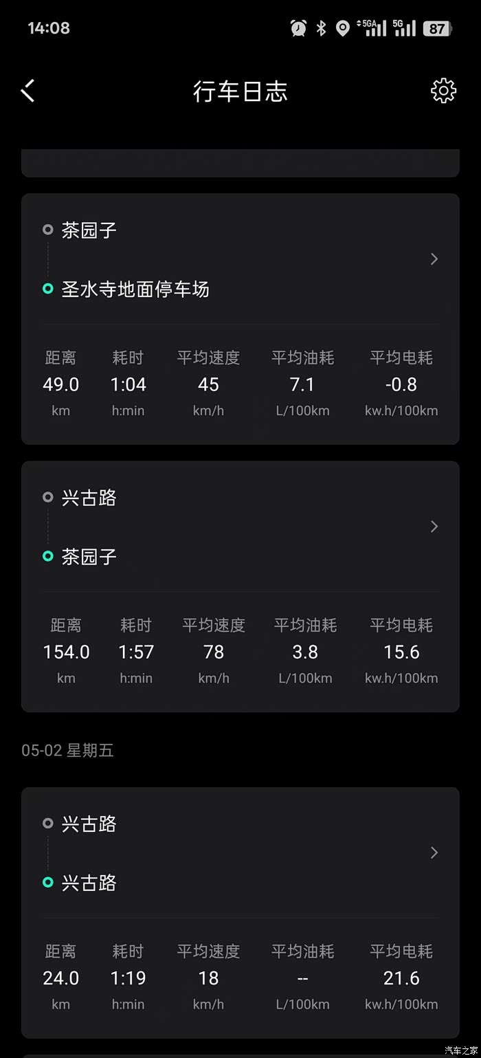 我目前全程都是开的智能电混(非常省心,智能切换),这张图就是五一期间跑的,很有代表性,代表三种能耗。
