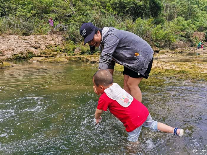 瀑布上游,小宝贝一直想扑往河水深处,妈妈一直小心地护着