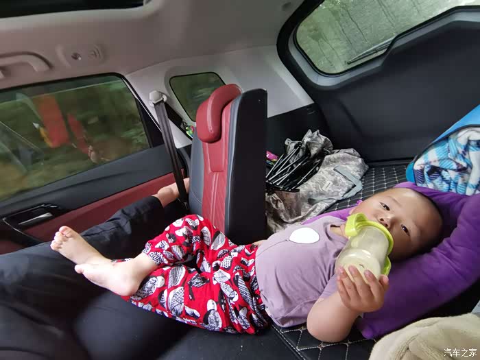 换了一身干净的衣服,小宝贝在车上葛优躺,还悠哉地吃着奶;风行T5后轴是采用独立悬挂的,减震效果很不错,所以小宝贝也很快就在车上睡着了。