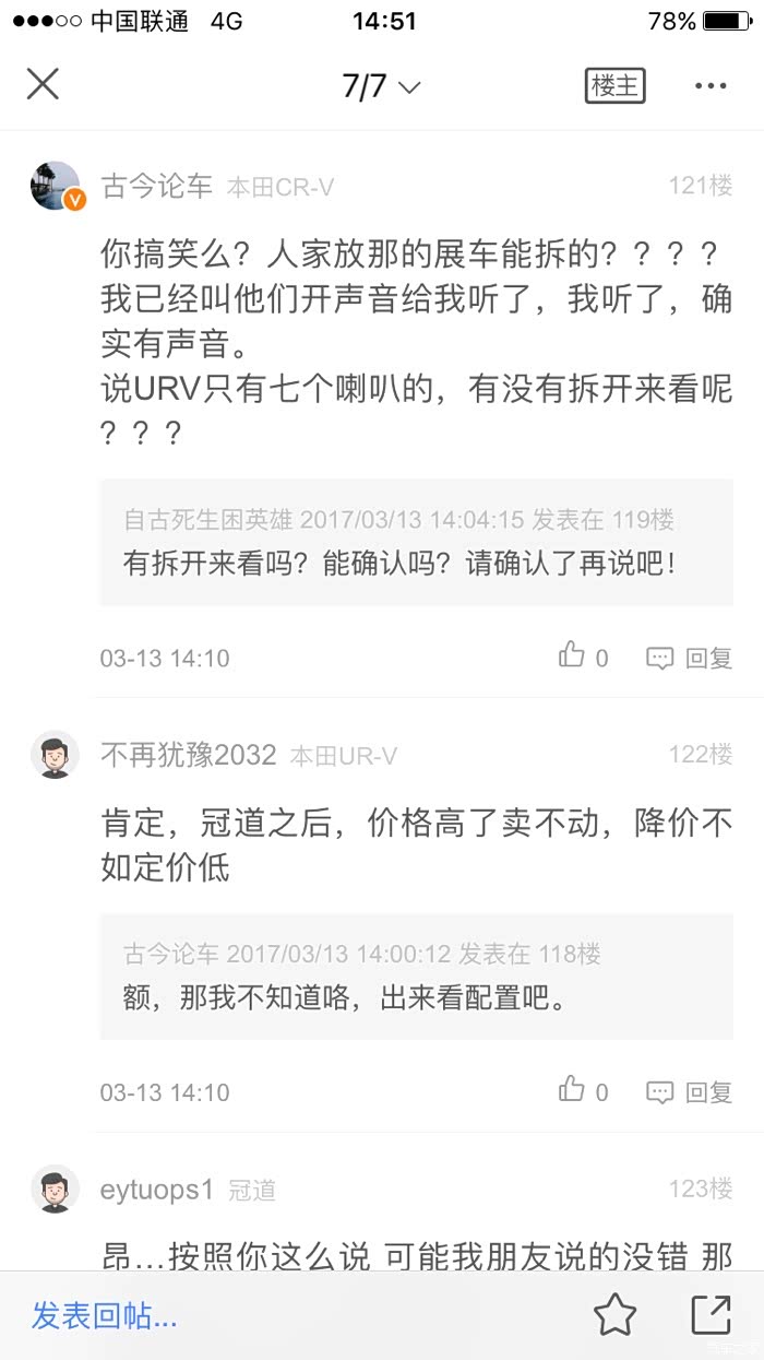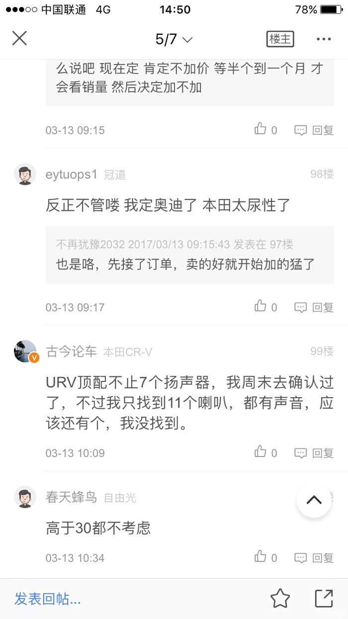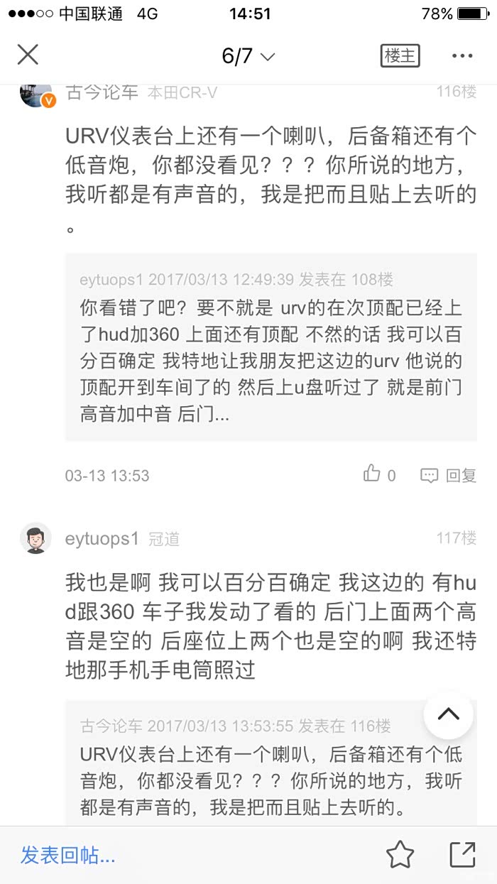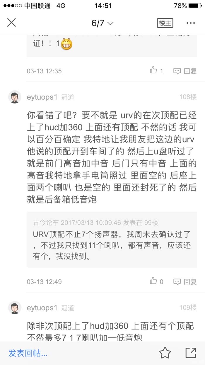 再回复古今论车同志:因为冠道的两驱版配置单写的是7喇叭,但是实车一样是12个喇叭位!结果拆开了里面有5个是空荡荡的!加上URV配置单已经出来了,顶配也是写着6-7喇叭,加上别人也用手电筒照了说没有,所以我认为只要你没有拆开起来确认,单单用听的说服力根本比不过他和厂家的配置单上写的!你自己说呢!?总不能厂家的配置单写错了加上人家手电筒照的也看错了吧!现在就是你能拆开顶配URV来看确认了到底有或没有后,你才能有足够的说服力压倒厂家配置单和拿手电筒看那个人!这就是我想表达的意思,至于你拆不拆得了展车就不是我能知道的了!因为我月底要提一辆顶配URV了,对于减配喇叭也是整个人都很不好(本来以为会跟冠道一样的配置,4S店销售也是叫我参考冠道配置的),听你说得我对12喇叭又有点小希望,就怕是希望越大失望越大!所以对于喇叭的问题很敏感,现在基本上所有的信息都指向只有7喇叭,本来已经是看要认命了,要是你给的信息不准确的话空欢喜一场,那直接就是双重打击!所以现在迫切的想确认,你如果能确认的话那真是万分感谢,我这样的准车主怎么会拿这种问题出来和你搞笑!?