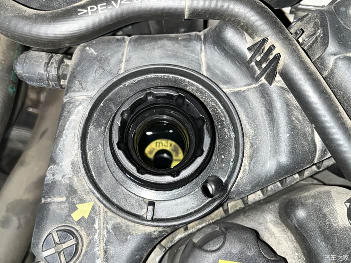 之前有过一次爆水管的经历,我知道车子肯定不能开了,于是赶紧靠边停下,熄火,打开引擎盖,手机上查了下防冻液水壶的位置(见笑了,第一次自己处理),慢慢拧开水壶盖(注意:热车一定要冷却一段时间后再打开水壶盖,否则高温冷却液可能会溅出并导致烫伤,我这里由于冷却液已经漏的不多了,所以没事),看了下水位,确实剩的不到一半了。