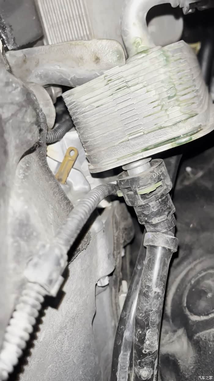 回去后在论坛查了下,果然是个通病,看来不是变速箱散热器的问题,而是机滤底座漏水,顺着变速箱散热器流下来了。