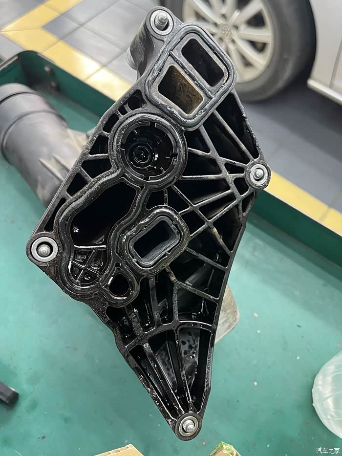 于是趁着零件还没到,又去附近的TH养车再检查一次,结果师傅说一看就知道哪里有问题了,宝马通病,这个问题他已经修了好几辆了,不过还是要检查确认下,把车升起来,拆了底板,漏水不明显,于是给水箱加压,确认了是机油滤芯底座漏了,还把他之前换下来的配件给我看了,其中有一个是底座中间的小方块崩了一个边。
