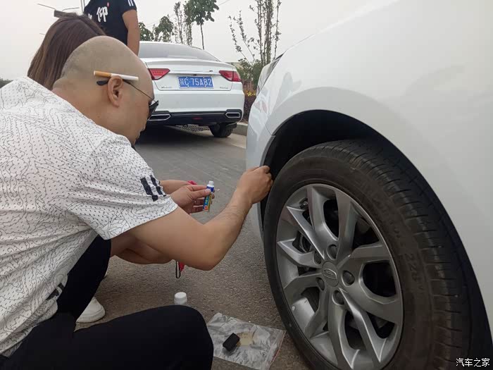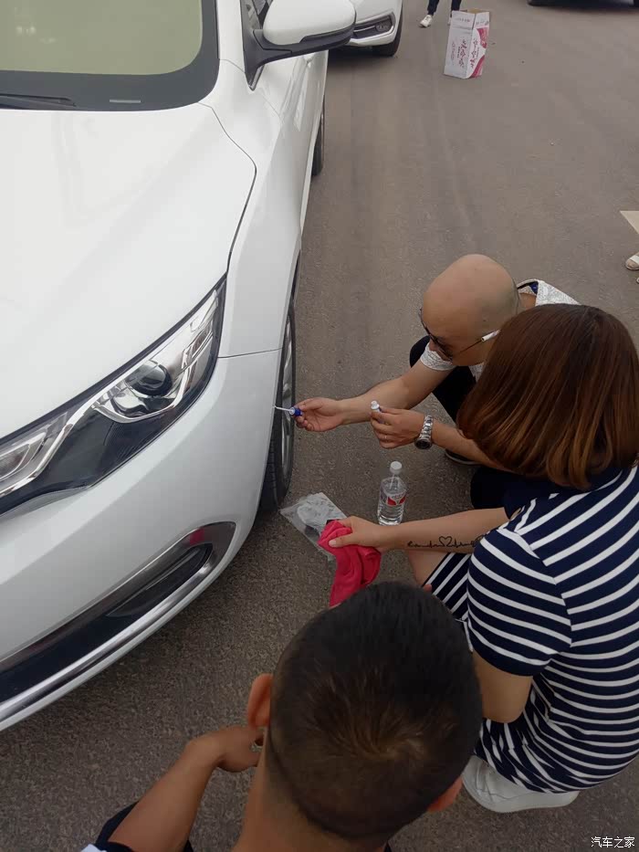 虽然我们最远,但我们来的最早!这位美女车友车子有几处小的刮蹭,热心的车友拿来自己的补漆笔,帮忙修补