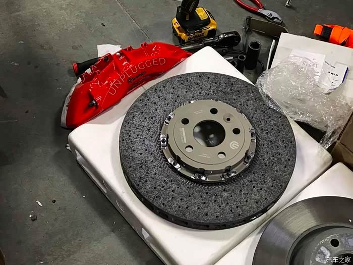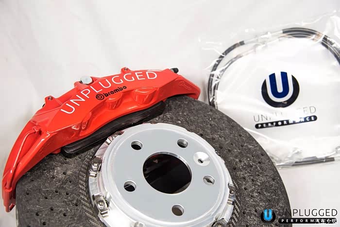 ,这是一个从来没见过的改装品牌,叫什么Unplugged。第一时间就开始动员力量去找资料了。394X34mm的碳陶碟,6活塞卡钳。简直太完美