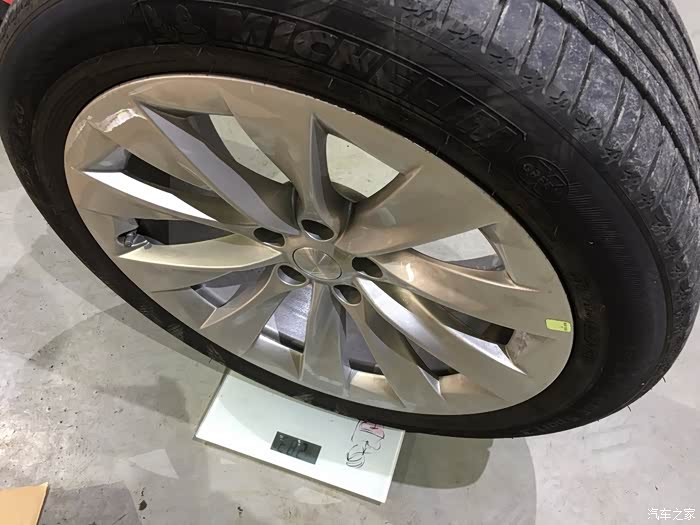 期间扎胎的一次发现,原厂LS3轮胎内侧,是有一圈海绵贴覆的,目的不言而喻:隔音~车主都应该知道,Tesla 的车底盘因为要照顾到电池组的散热,所以隔音非常差。那么在选择轮胎的时候,考虑就比较多了。上图HRE的这部车后轮胎用的是285,但是想要更宽到305,就要考虑这么宽会不会轮胎蹭轮眉。当时车还没到的时候去4S量了一下数据,又对比了Model X原厂的轮毂数据,得出的结果是305的后胎并没有问题