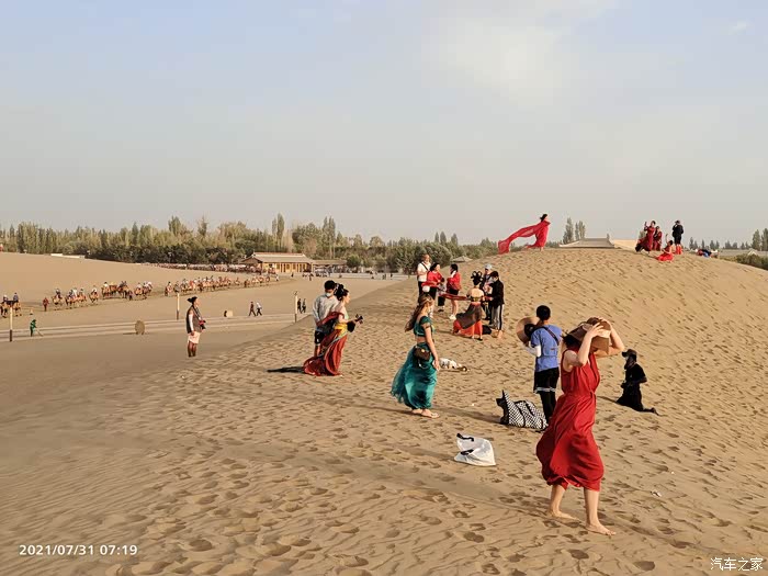 在鸣沙山上拍照的,啥人都有,一大早就来了,景区早5点就开门。不过风很大,沙子打在腿上还有点疼。没敢拿出单反相机。