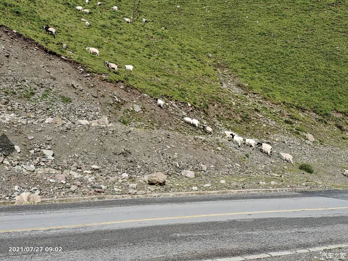 达坂山隧道是带有保温层的隧道,大家可以百度一下。空中一直有阴云和小雨。游客们都很兴奋,是不是停在路边拍照,但风大气温低,需要至少长袖衣裤保暖。达坂山很出名,因为在古代丝绸之路上,这是毕竟路段之一,达坂意为可以翻越的意思。