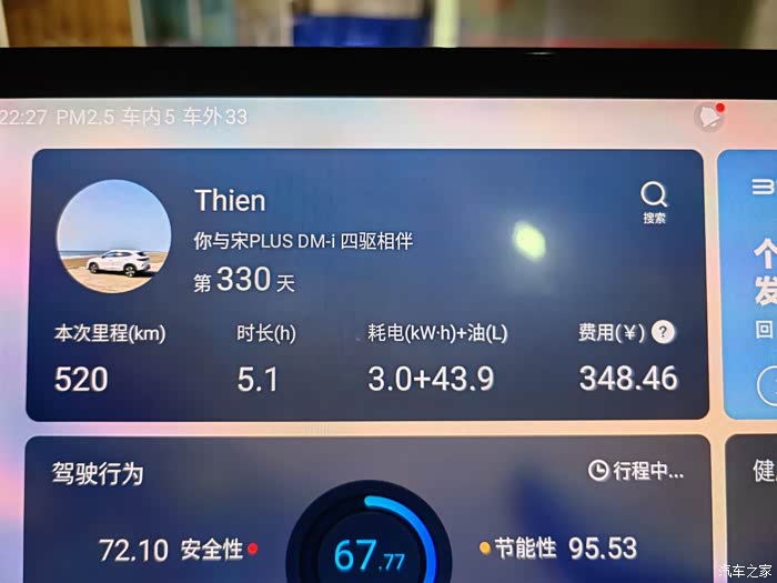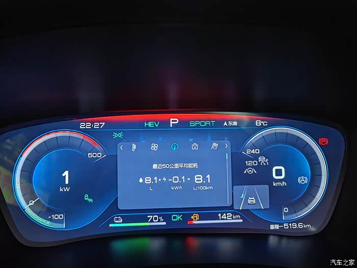 3个人,气温10摄氏度,小雨,空调1挡风26℃,HEV运动模式强保70,全程定速120时速,跑了520公里剩余70电,油亮灯显示还能142公里。按照这么跑满油满电高速大概跑650公里左右。