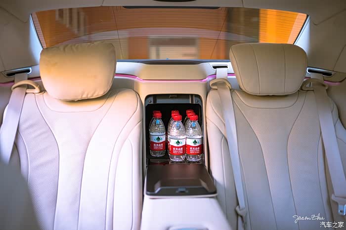 奔驰S的储物空间还是非常丰富的,车门和扶手就不说了,这个后排冰箱位的地方很好玩,一个比冰箱容积还大的空间,可以放下12瓶矿泉水,只是放得东西少的话,大力刹车时,能听到里面哐当,所以我一般都把它放的满满 的。经常有人上来,以为这是冰箱呢,很惊奇这里还有这么大的空间。