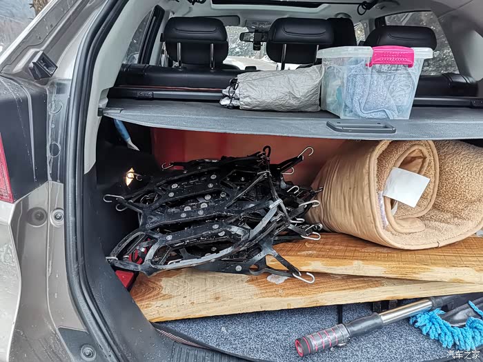 乱七八糟地扔进后备厢,防滑链,先留着,或许以后再买,正常的可以作为备用。不过多半是要废了,以后可能还是买金属防滑链了。