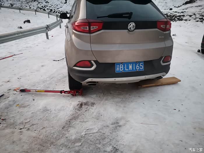 前文讲述了手刹线冻住的故事。这是最初我在装防滑链的情况,冰雪与坡度是用千斤顶的危险因素,千斤顶高度不够,又容易倒,最后是旁边一小车车主借用了小铲子,将车轮下的雪铲掉,才安装上防滑链。这个应该反醒自已,锐腾四驱对付不了冻,防滑链应该在进入雪地前安装,山上时常没有合适地形。