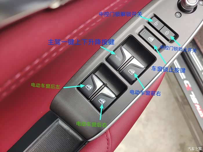 这两图就是75plus主驾车门上的控制按键图解功能,拥有车窗一键升降,外后视镜电动调节和折叠功能,拥有车窗升降,锁止,车门开关锁的功能
