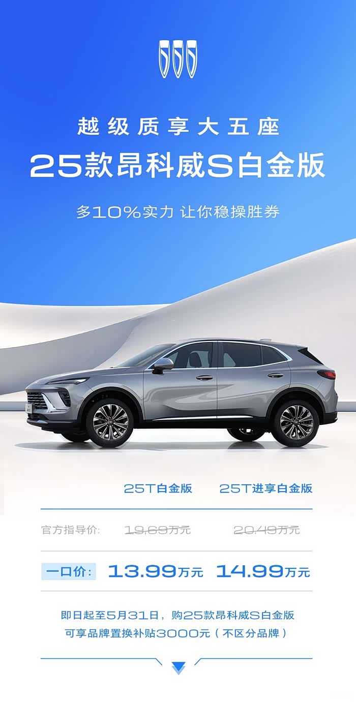 2025年3月18日 上汽通用汽车别克品牌宣布:越级质享大五座SUV——25款昂科威S白金版焕新上市。新车推出“一口价”,其中25T白金版13.99万元,25T进享白金版14.99万元。即日起至5月31日,用户购买昂科威S白金版,可享任意品牌车型置换补贴3000元,并可叠加国补地补。新车秉持“多10%”的产品精神打造,在性能操控、安全品质、舒适静谧和智能配置等多方面领先,为年轻家庭带来15万级燃油SUV市场中“高半级”的购车新选择。昂科威S白金版上市后,将与昂科威Plus组成越级“双子星”,在竞争激烈的燃油SUV市场开创新格局。
